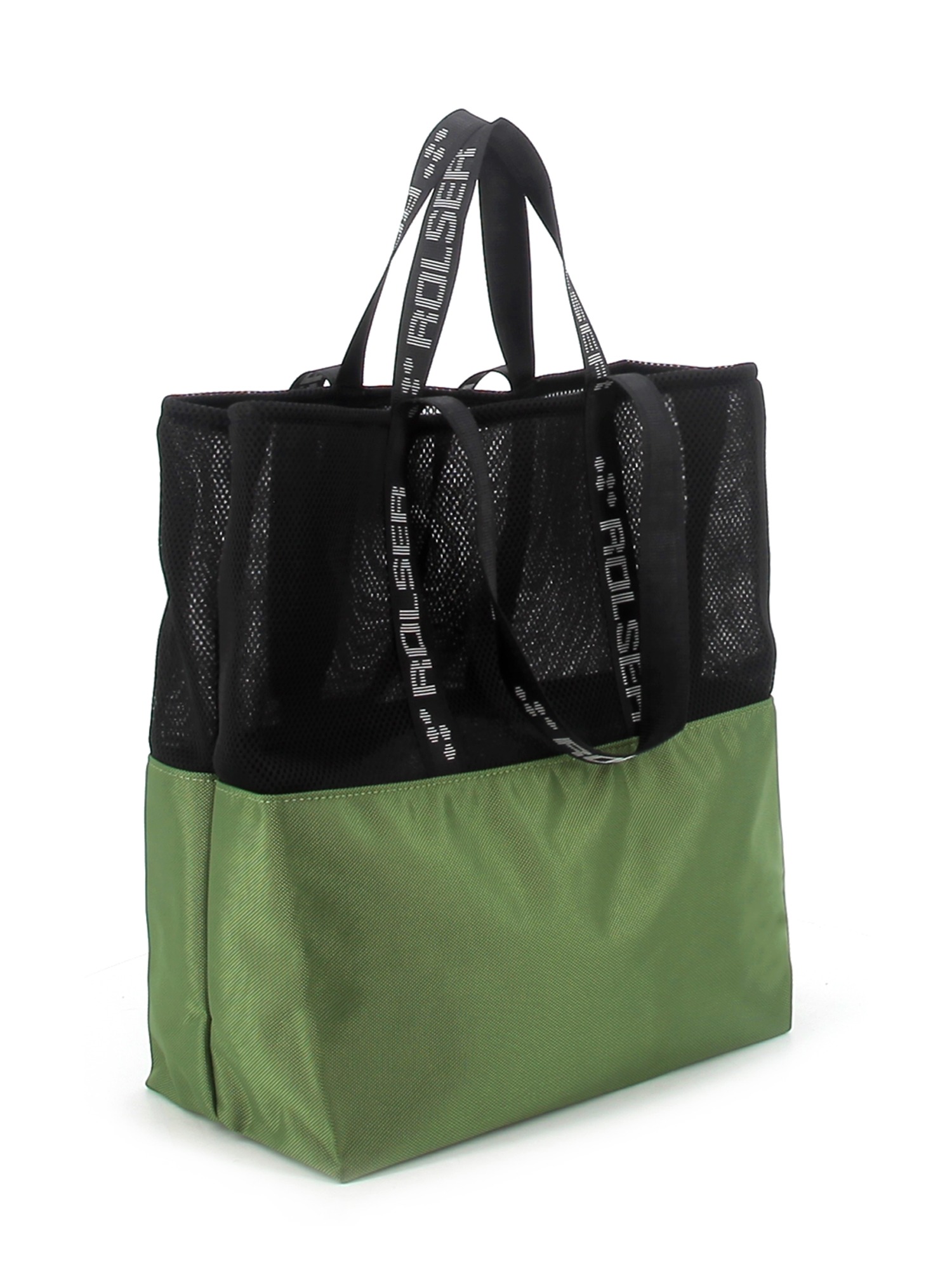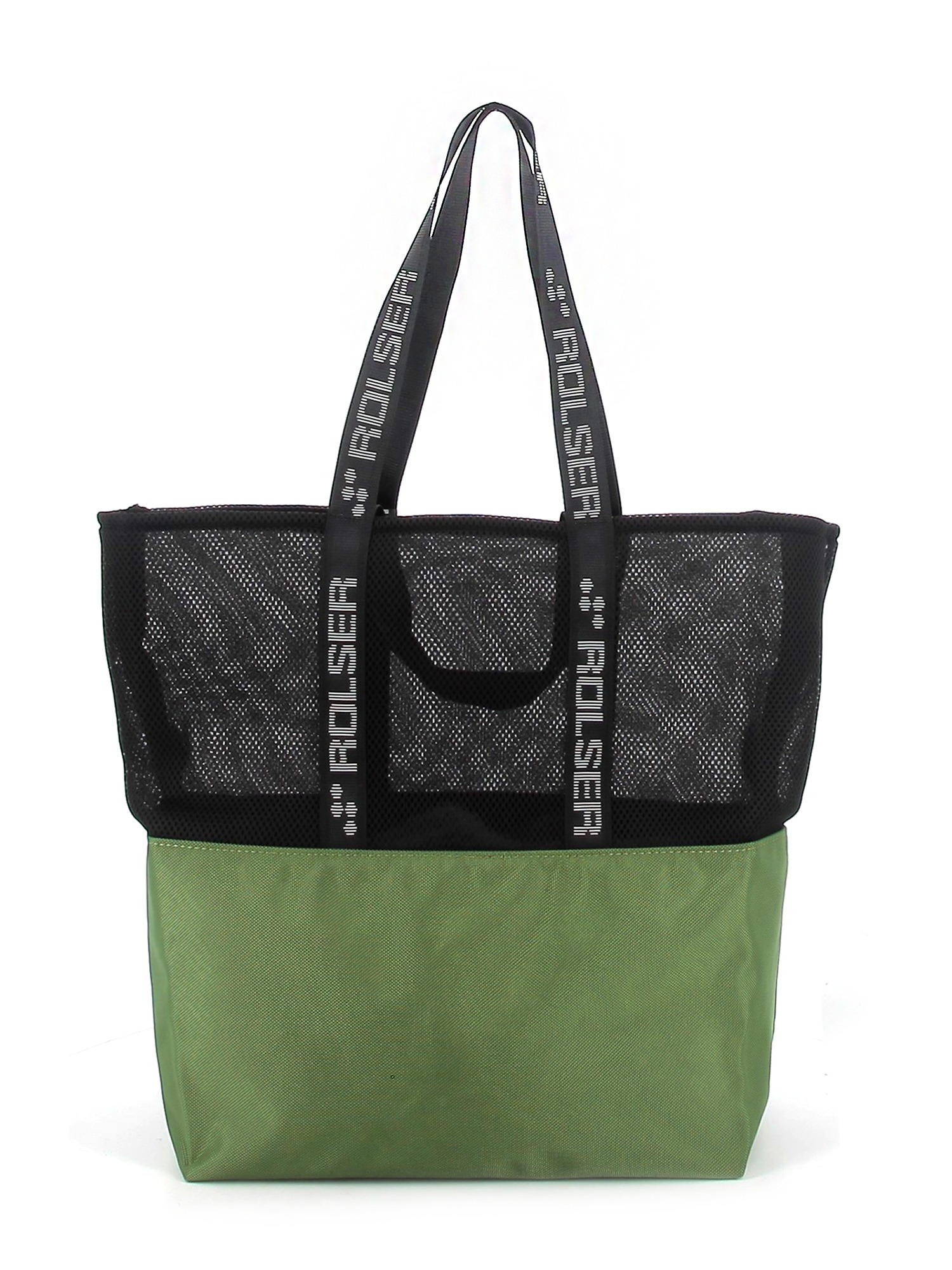 Maxi shopping con acabados en rejilla en los colores kaki, azul klein y negro, doble bolsillo interior y con dos asas de diferentes tamaños. Novedades notables que conforman una gama de productos que apuestan por eliminar el uso masivo de la bolsa de plástico. El bolso perfecto para tus días de playa o simplemente como parte de tu estilo.