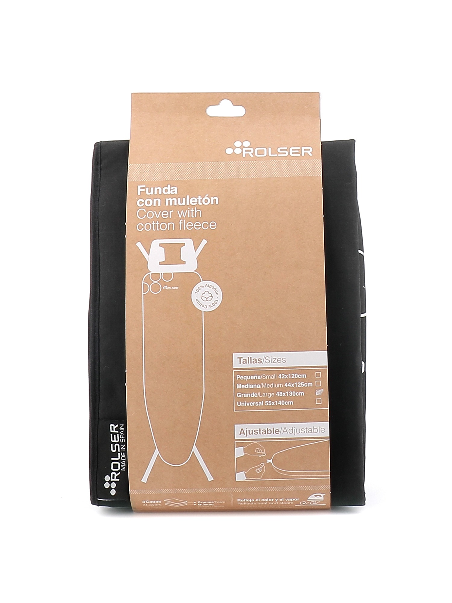 ROLSER COVERTS WITH Cotton FLEECE (480 x 4 x 1300 mm ). Original spare for Rolser K-TRES and K-22. ironing boards. Cotton, with a highly resistant adjustable cord that wraps the cover around the board. The ideal accessory for a perfect ironing experience. The Cotton fleece base combined with the top fabric make for a convenient sliding of the iron that will ensure easier ironning. The new NATURAL PROCESS covers for the ironing boards help to turn this everyday action into an exceptional experience. Exceptional due to their nature, envionmentally friendly, using fabrics sourced from textiles resulting from a thorough process of recycling by selection. This avoids using an additional dye for its prparation, therefore its colours are those of the recycled garments themselves. Ironing while caring for the environment ? Who would have guessed this.. Maybe ROLSER ? You can find these new NATURAL PROCESS covers on all our ironing boards, or if you prefer, they can be puchased separately to renew (and recycle ! ) your current ironing board.