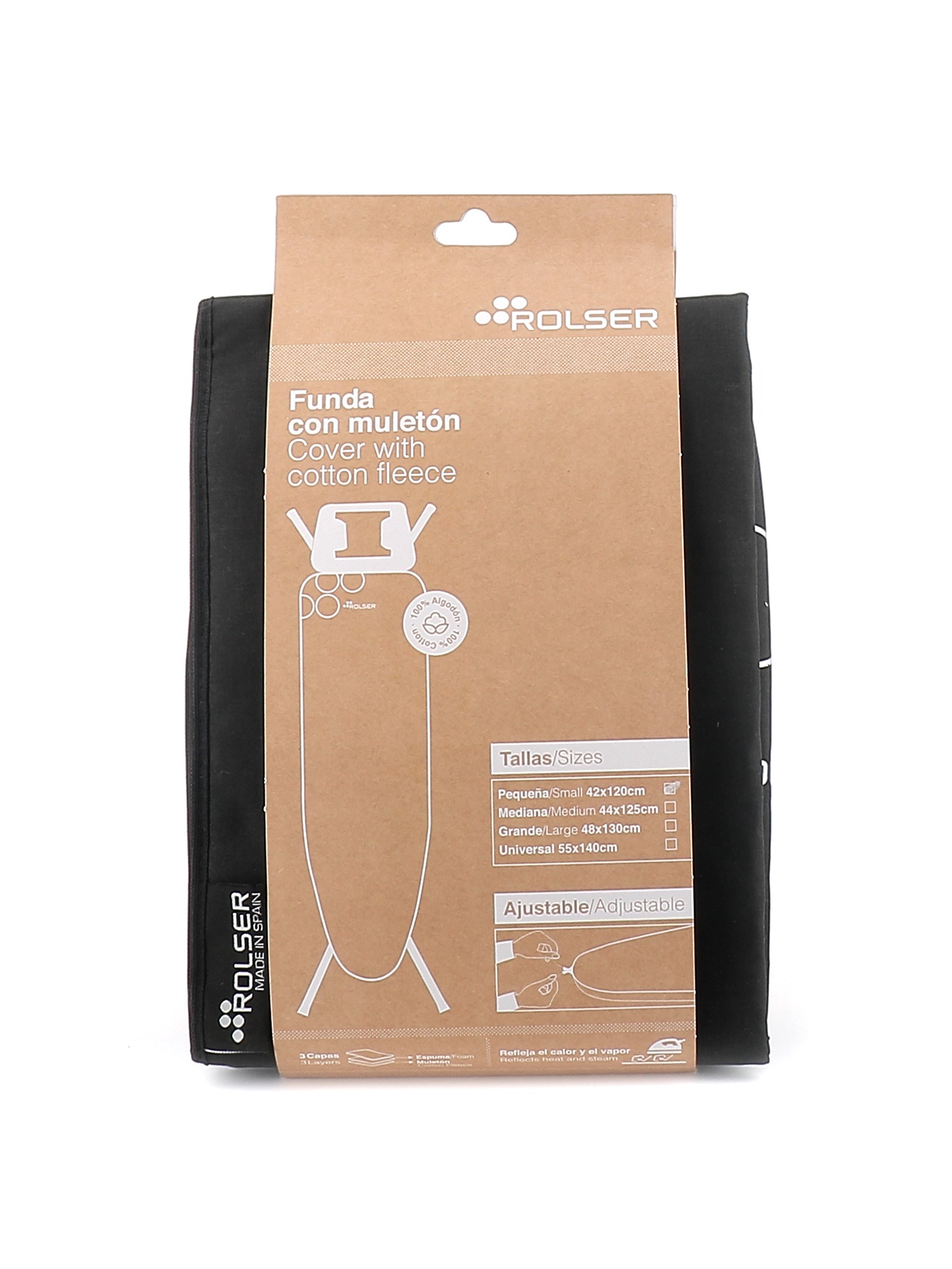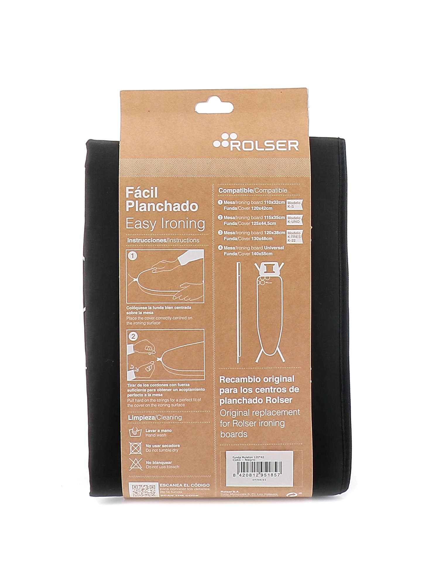 ROLSER COVERTS WITH Cotton FLEECE (420 x 4 x 1200 mm ). Original spare for Rolser K-S ironing boards 1100 x 320 cm. Cotton, with a highly resistant adjustable cord that wraps the cover around the board. Measurements of the ironing cover: 420 x 4 x 1200 mm. The ideal accessory for a perfect ironing experience. The Cotton fleece base combined with the top fabric make for a convenient sliding of the iron that will ensure easier ironning. The new NATURAL PROCESS covers for the ironing boards help to turn this everyday action into an exceptional experience. Exceptional due to their nature, envionmentally friendly, using fabrics sourced from textiles resulting from a thorough process of recycling by selection. This avoids using an additional dye for its prparation, therefore its colours are those of the recycled garments themselves. Ironing while caring for the environment ? Who would have guessed this.. Maybe ROLSER ? You can find these new NATURAL PROCESS covers on all our ironing boards, or if you prefer, they can be puchased separately to renew (and recycle ! ) your current ironing board.