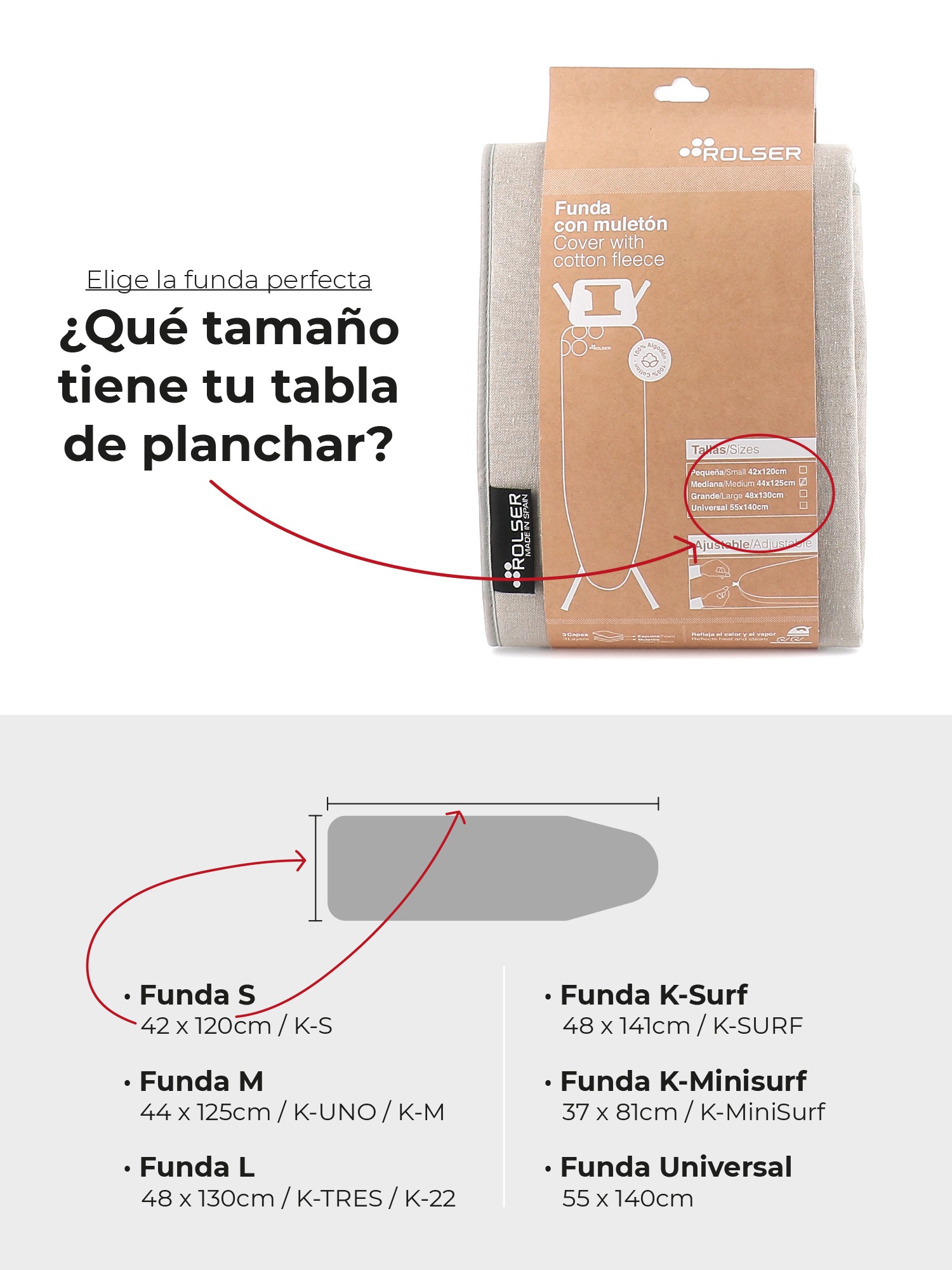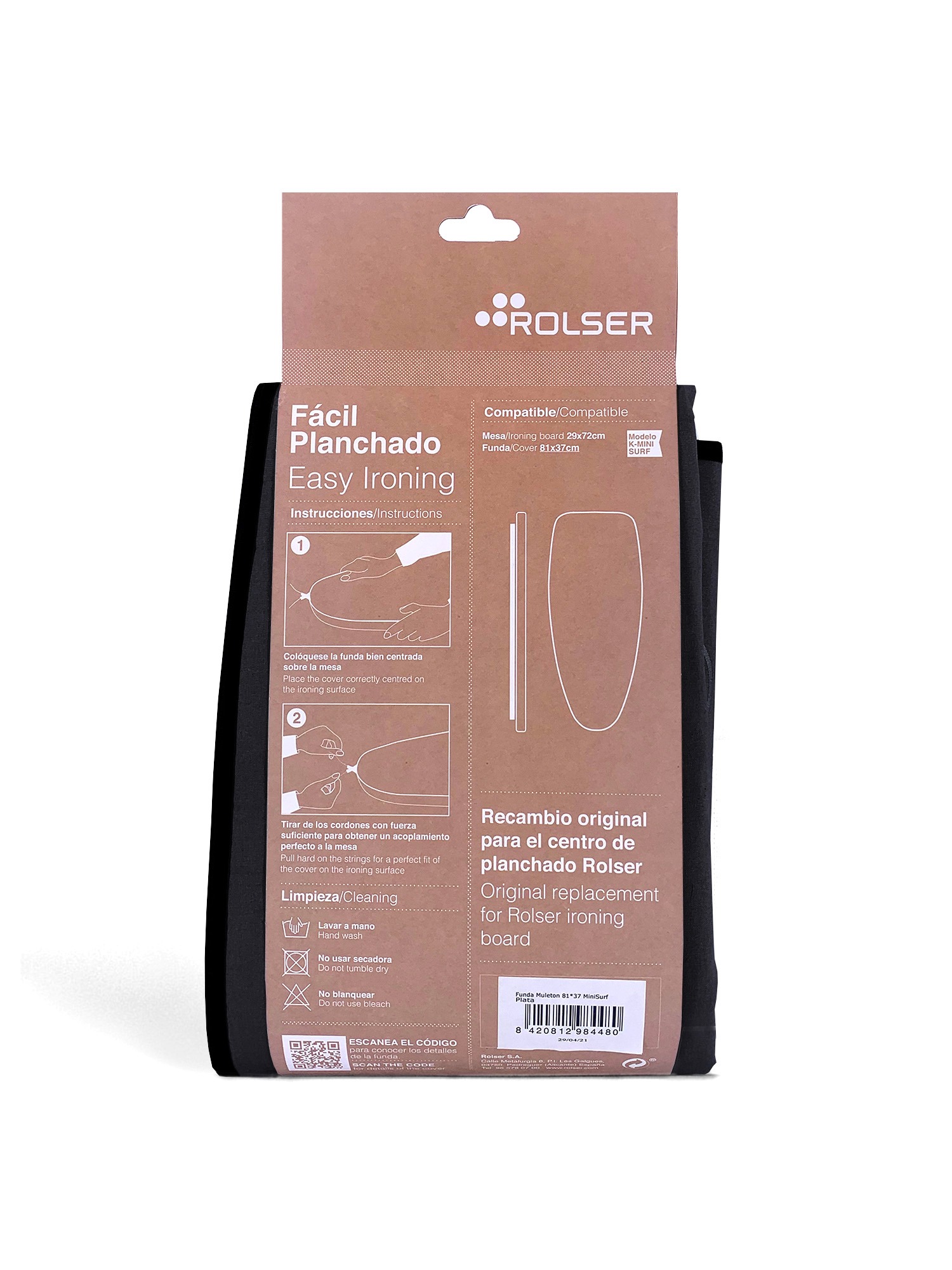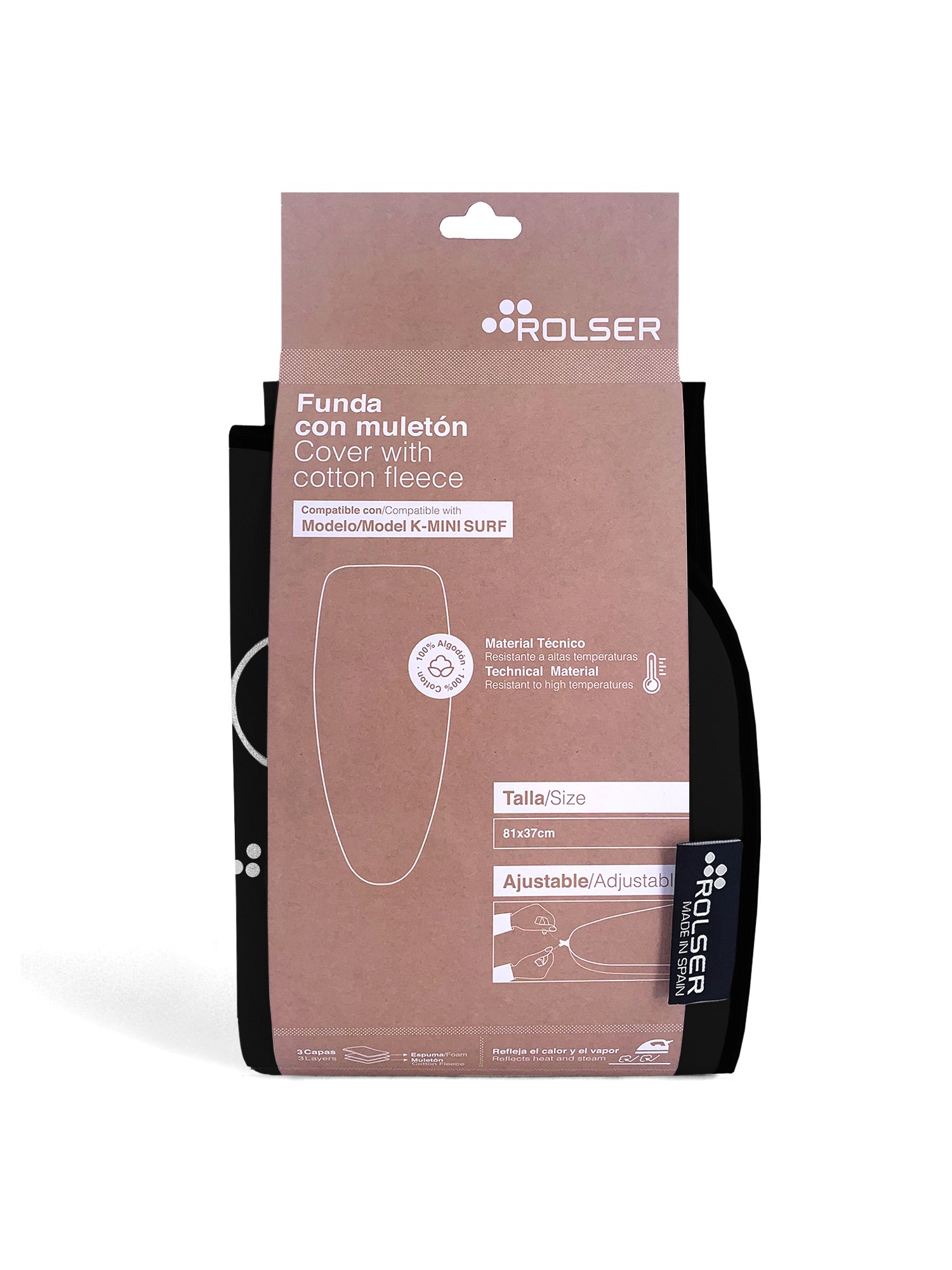 ROLSER COVERTS WITH Cotton FLEECE ( 370 x 4 x 810 mm ). Original spare for Rolser K-MINI SURF x cm. ironing boards. Special K-MINI SURF fabric, Cotton with technical coating that makes it resistant to high temperatures and Cotton fleece fabric. Available in 2 clours, Black and Silver. Combination of elegance in its design and full features to make the daily task of ironing more practical. Covers with a highly resistant adjustable cord that wraps the cover around the board. The ideal accessory for a perfect ironing experience. The Coton fleece base combined with the top fabric make for a convenient sliding of the iron that will ensure easier ironning.